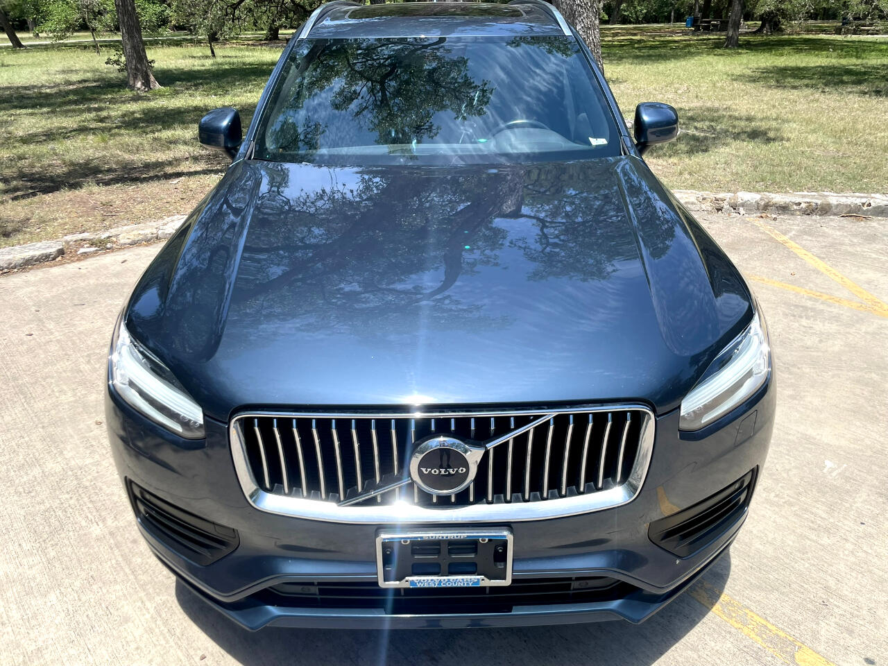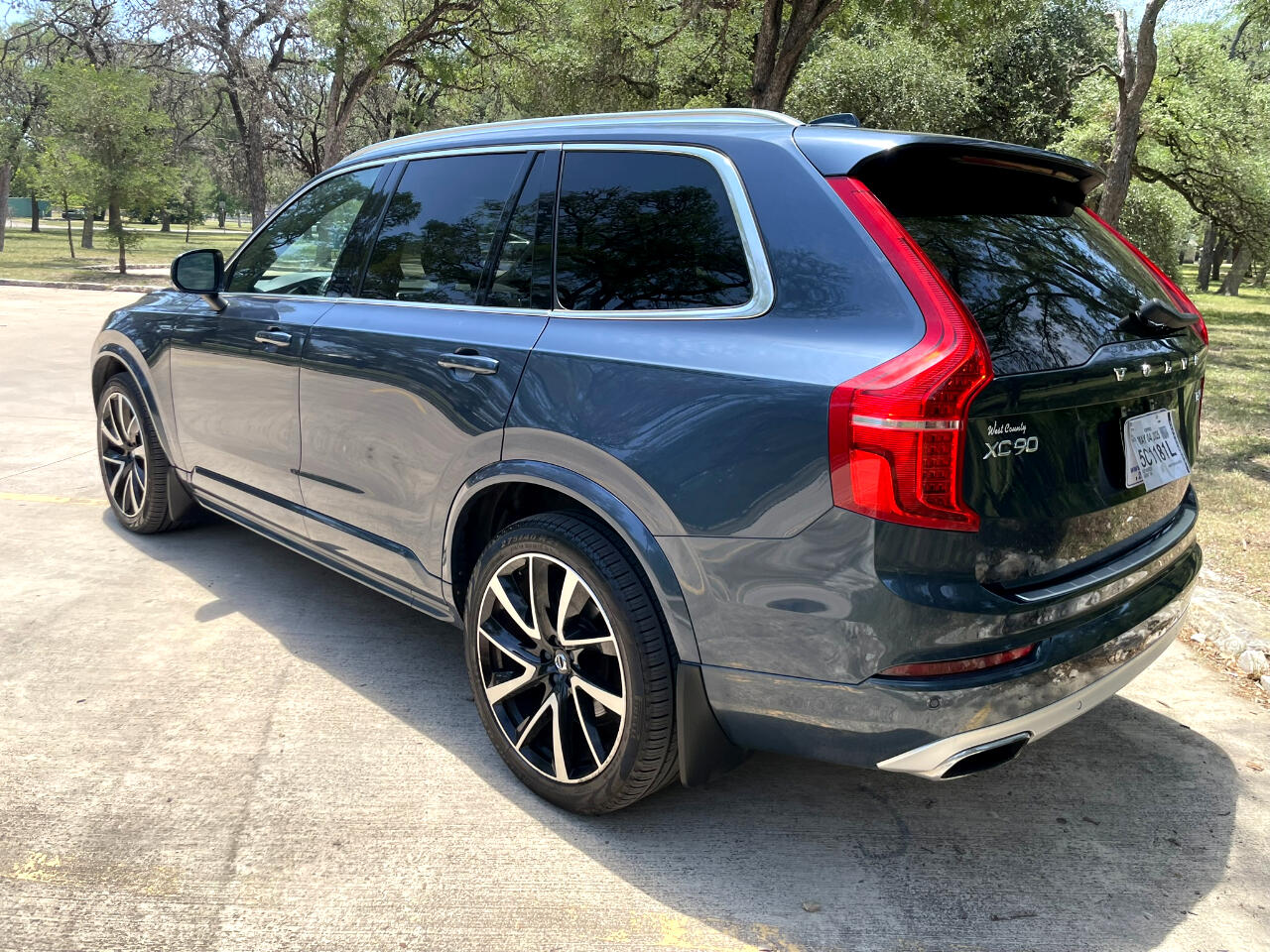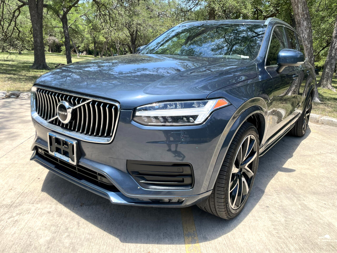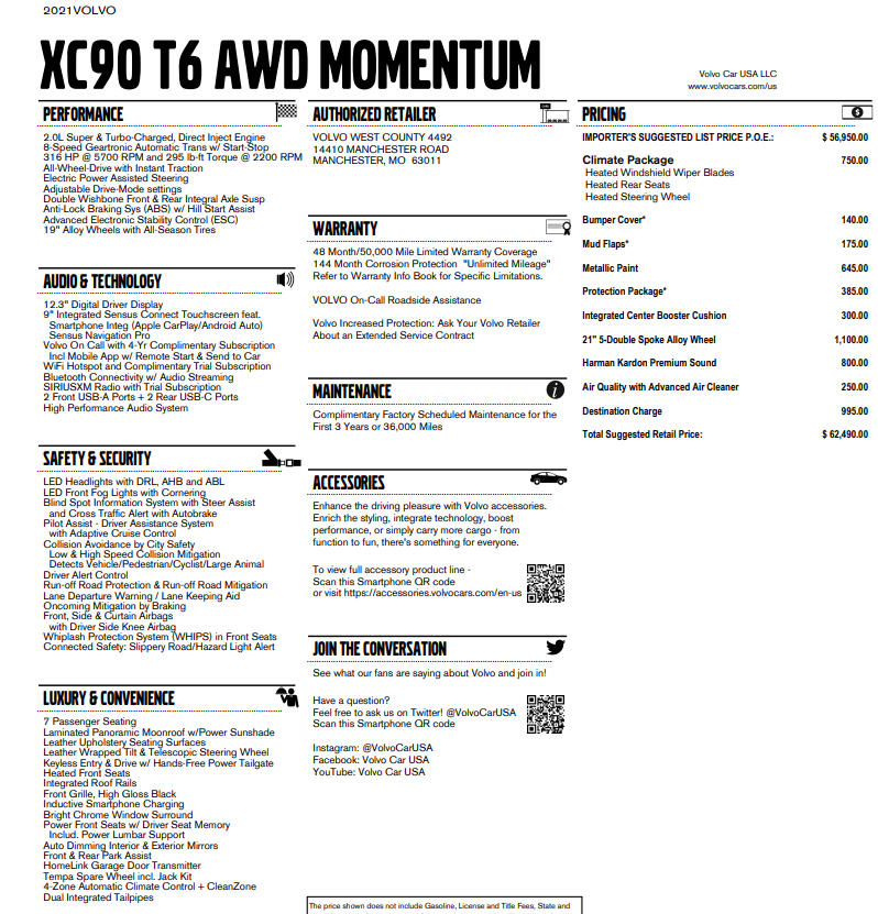 2021 VOLVO XC90 T6 MOMENTUM DENIM BLUE MAROON BROWN LEATHER UPHOLSTERY ALL WHEEL DRIVE TURBOCHARGED 2.0L 4 CYL GEARTRONIC 8 SPEED AUTOMATIC TRANSMISSION W OVERDRIVE AM/FM/XM HARMON KARDON SOUND BLUETOOTH BACKUP CAM KEYLESS ENTRY COOLED & HEATED SEAT POWER SEAT SPLIT FOLD THIRD ROW SEAT 21 INCH ALUMINUM ALLOY WHEELS POWER LIFT GATE REAR WINDOW WIPER ROOF RAILS 25051462206274