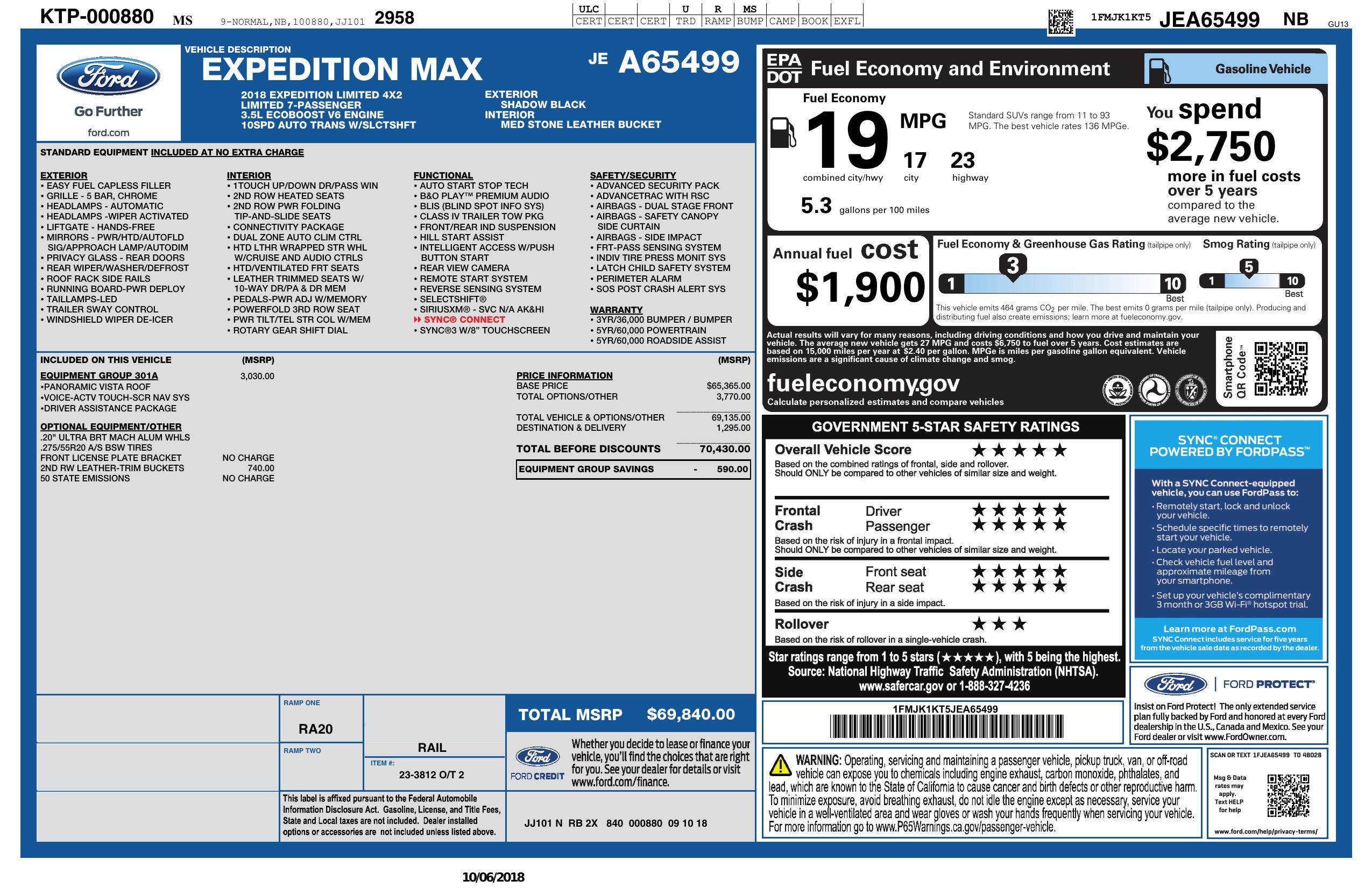 2018 FORD EXPEDTION MAX LIMITED SHADOW BLACK METALLIC MEDIUM STONE LEATHER UPHOLSTERY WEATHERTECH FLOOR LINERS 3.5L ECOBOOST V6 10 SPEED SELECTSHIFT AUTOMATIC TRANSMISSION W OVERDRIVE AM/FM/XM BANG & OLUFSEN SOUND BACKUP CAM RELOTE KEYLESS ENTRY INTEGRATED NAVIGATION SYSTEM PUSHBUTTON START COOLED & HEATED SEAT POWER SEAT W MEMORY QUAD SEATING POWER STEERING WHEEL ADJUST SPLIT POWER FOLD THIRD ROW SEAT 20 INCH ALUMINUM WHEELS POWER RUNNING BOARDS POWER LIFT GATE REAR WINDOW WIPER ROOF RAILS TOW PACKAGE 25102940414095