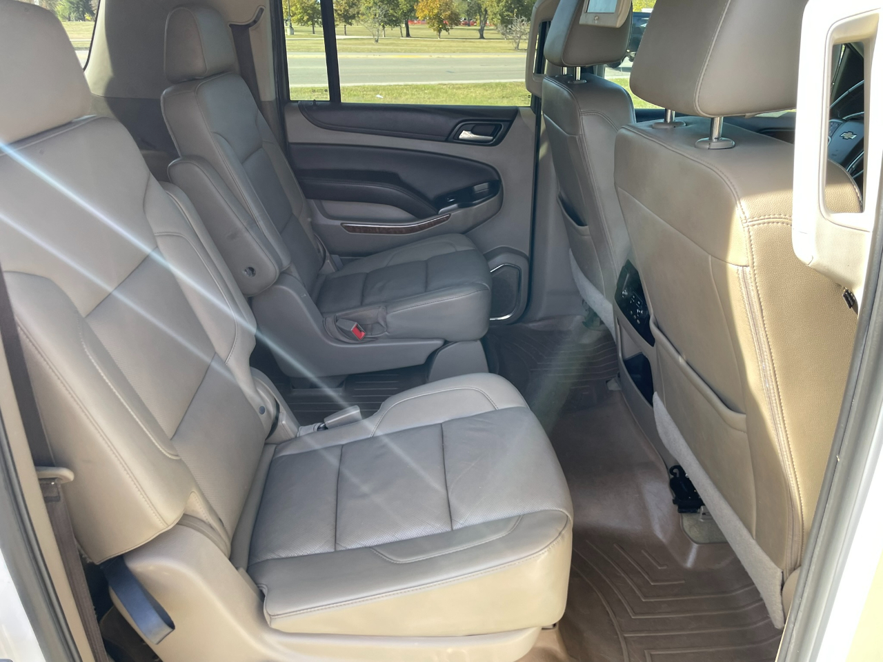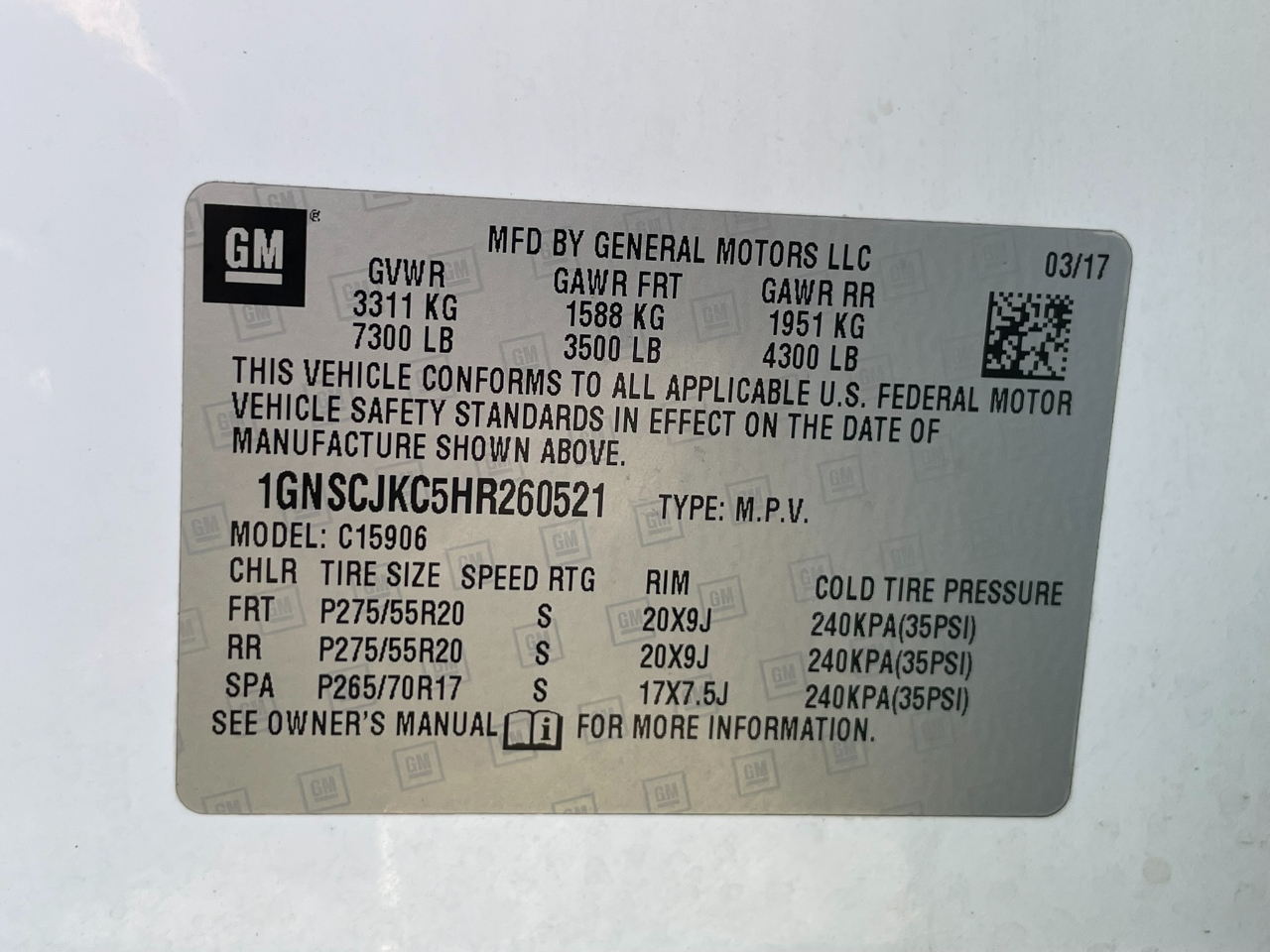 2017 CHEVROLET SUBURBAN PREMIER SUMMIT WHITE COCOA LEATHER UPHOLSTERY 5.3L V8 6 SPEED ELECTRONICALLY CONTROLLED AUTOMATIC TRANSMISSION W OVERDRIVE AM/FM/XM BOSE SOUND DUAL REAR DVD ENTERTAINMENT SYSTEM BACKUP CAM REMOTE KEYLESS ENTRY PUSHBUTTON START QUAD SEATING SPLIT FOLD THIRD ROW SEAT 20 INCH POLISHED ALUMINUM WHEELS RUNNNING BOARDS POWER LIFT GATE REAR WINDOW WIPER TOW PACKAGE 25121059766029
